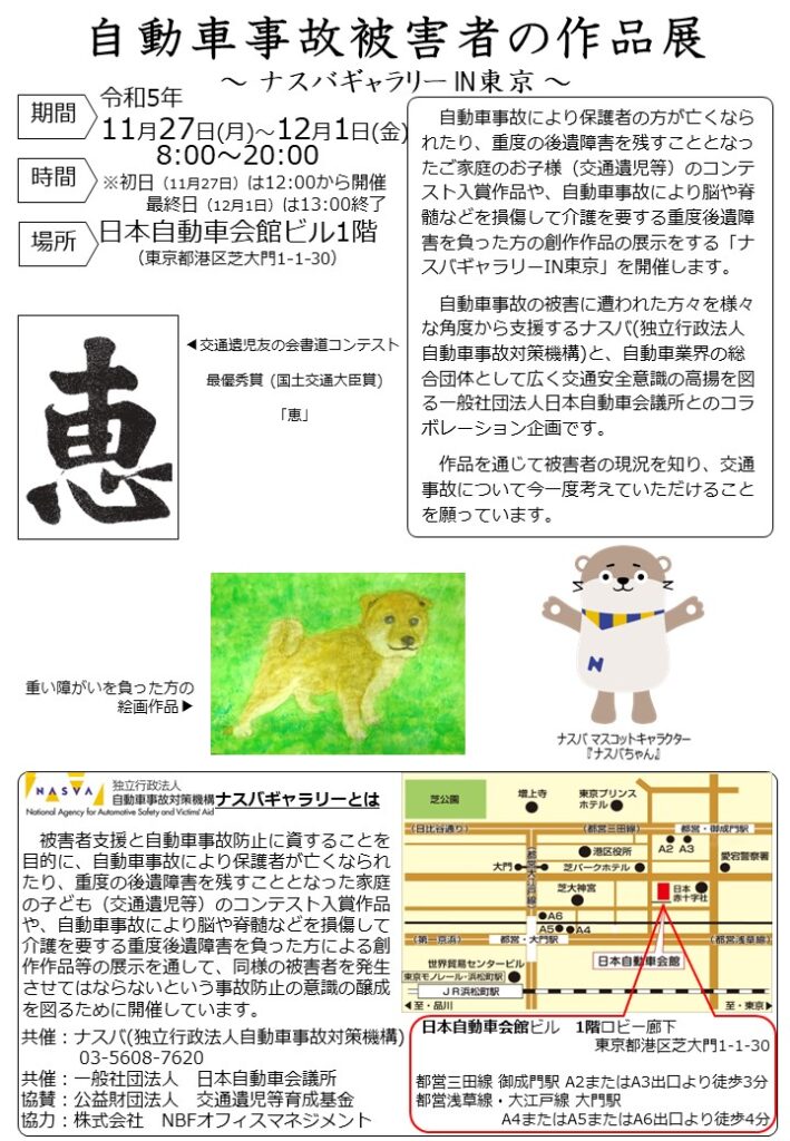⾃動⾞事故により保護者の方が亡くなられたり、重度の後遺障がいを残すことになった家庭のお子様(交通遺児等)のコンテスト⼊賞作品や、自動車事故により脳や脊髄などを損傷して介護を要する重度後遺障がいを負った方の創作作品の展⽰をする「ナスバギャラリー IN 東京」を開催します。