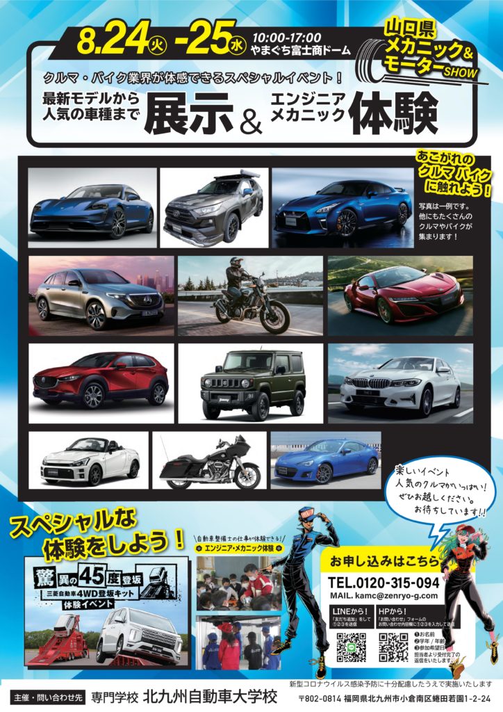 北九州自動車大学校(籠谷正則校長、福岡県北九州市)は、24、25日に山口市内のやまぐち富士商ドームで「山口県メカニック&モーターSHOW」を開催する。県内の自動車関連企業18社がブース出展し、車両展示やメカニック体験コーナーを設ける。同校主催による山口県内でのイベントは今回が初めて。