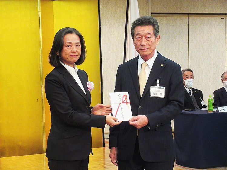 寄付金の寄贈先と寄付金額は、日本赤十字社に100万円、交通遺児育英会(石橋健一会長)と交通遺児等育成基金(小幡政人会長)にそれぞれ50万円。日本赤十字社、交通遺児育英会への寄付金は日刊自動車新聞社(花井真紀子社長)に寄託。海津会長・理事長から花井社長へ目録が手渡された。