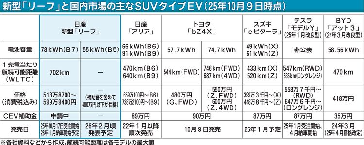 日産は15年前に初代リーフを投入してから、長らく競合車種が存在しない状況が続いたが、トヨタをはじめスズキも「eビターラ」でEV市場に参入し、ホンダも軽自動車「N─ONE e:」(エヌワンイー)を投入。テスラやBYDなど輸入車勢も攻勢を強める中で「EV市場が盛り上がる」(杉本全執行職)とみる。従来のハッチバックからクロスオーバーSUVへと車型も変化させた新型リーフで、HVの〝大衆化〟を実現した「トヨタ『プリウス』のようなEVを目指す」(寺西チーフマーケティングマネージャー)という。