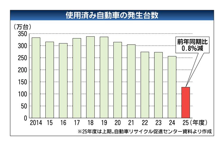 使用済み車は18年度をピークに、減少に歯止めがかかっておらず、24年度も前年度比6.0%減の256万666台だった。25年度について、業界内では「今秋にも下げ止まり、反転する。上期の微減は想定内だった」という受け止めもあったものの、実際にいつになれば下げ止まるのかは依然不透明だ。