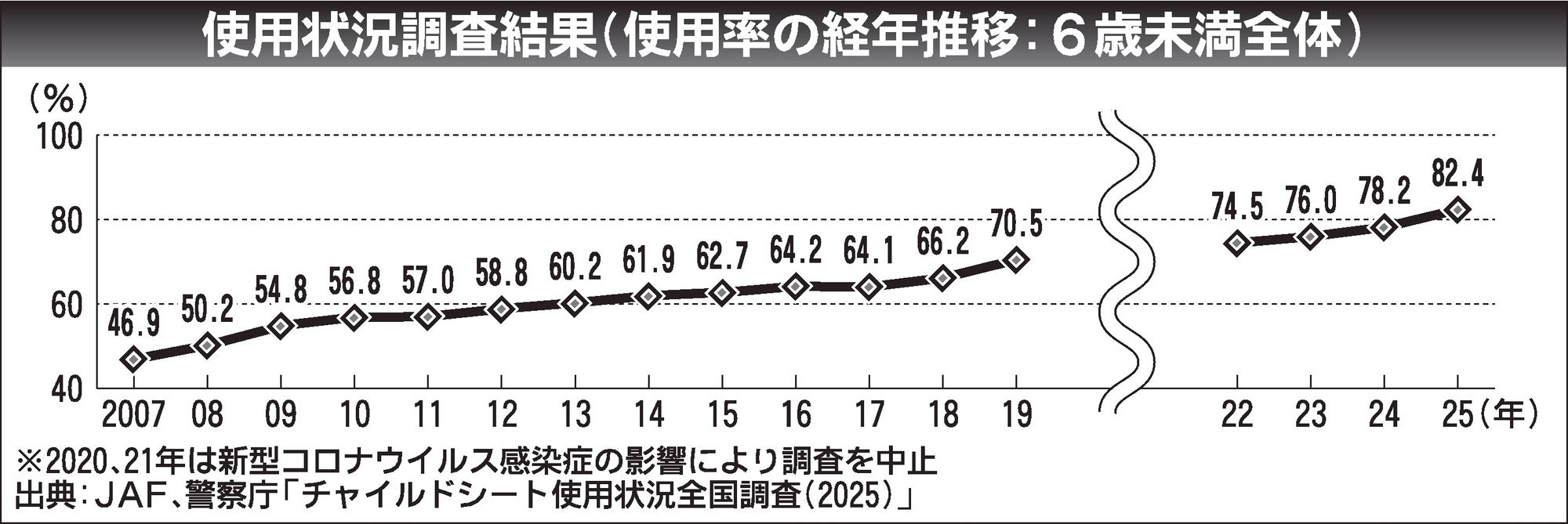 日本自動車連盟(JAF、坂口正芳会長)は、警察庁と合同で実施した2025年の「チャイルドシート使用状況全国調査」の結果を公表した。道路交通法に基づき使用義務がある6歳未満の子どもに対する使用率は、初めて8割を超えて過去最高を更新した。年齢層別で最も使用率が低い5歳も、これまでの5割台から6割後半まで増加した。