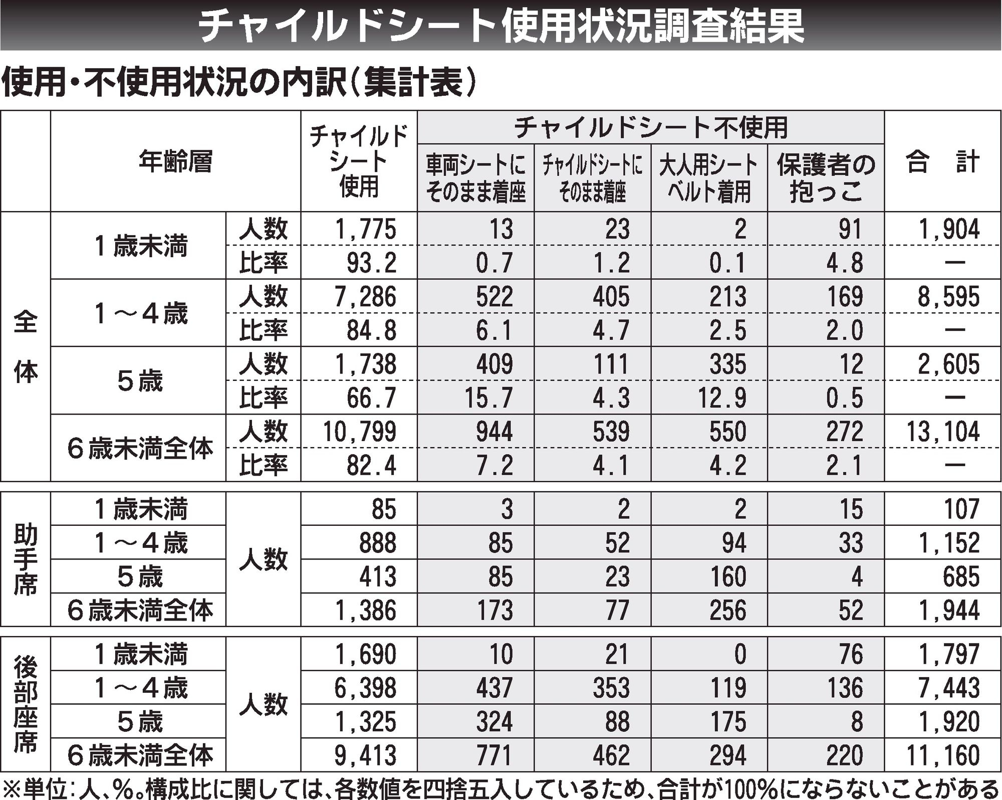 02年に合同調査を開始してから、使用率が初めて8割を超えたが、使用が義務付けられている6歳未満の子どものうち、約6分の1が依然として不使用との実態もある。乗車位置でみると、助手席における不使用率は28.7%で、後部座席の15.7%と比べて高かった。