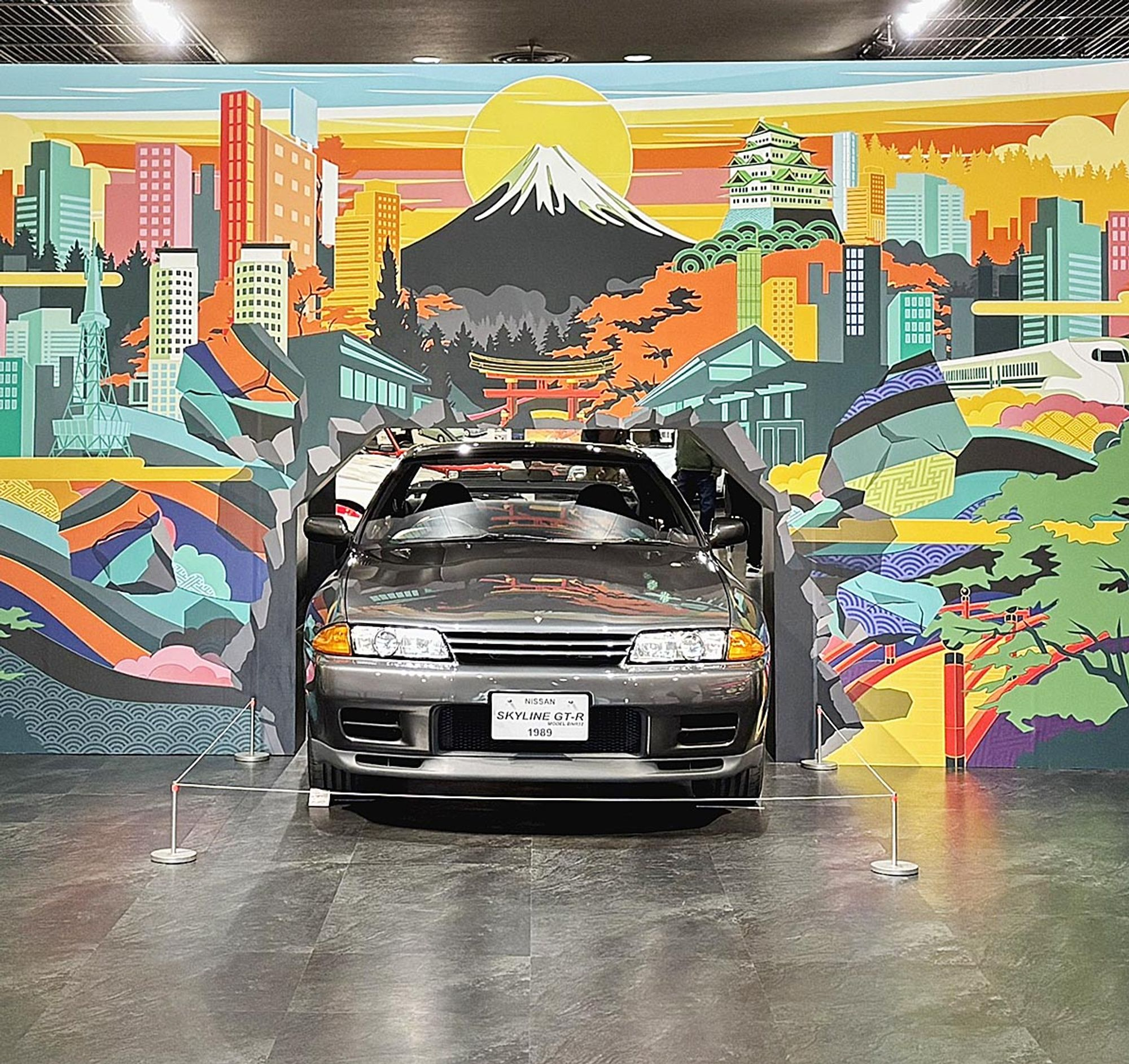 富士山やお城、鳥居に都会のビル群―。独特の色合いのパネルから飛び出す1台の車がある。1989年に発売した日産自動車の「スカイラインGT―R」だ。今回の展示のシンボルカーであり、JDMを語る上でも欠かせない。