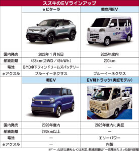 現在のEVの開発は、自社開発とトヨタグループとの連携の2軸で進めている。「eビターラ」のeアクスルは「ブルーイーネクサス」製を採用する。デンソーとアイシン、トヨタ自動車が共同出資する企業だ。トヨタ、ダイハツ工業と3社で共同開発している軽商用EVも同様だ。