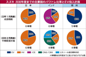 スズキが2年前に発表した、30年度を見据えた成長戦略では、各市場でEV普及が伸びると想定していたが25年2月の新中計で修正した。インドと欧州は投入モデル数を減らした。インドでのEV販売(24年度)は11万台で全体の2~3%にとどまる。