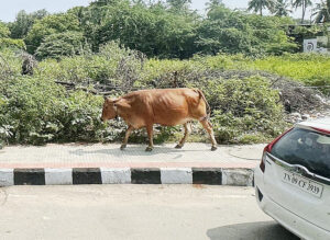 歩道を歩く牛。水牛を含めて3億頭いるという(24年10月にインド・チェンナイで撮影)