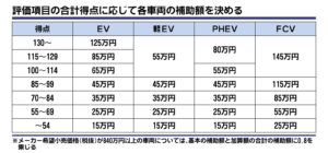 EVでは従来、鋼材の加算を除いた合計点を6種類に分け、15万円から85万円までの補助額を割り当てていた。今回、加算を除く補助上限額が125万円となったことで、得点の分類が7種類に増加した。従来から高い評価を受けていた日本車やテスラ「モデル3」などは、最大で40万円増額した。一方で、従来から得点が低い輸入車では補助額が据え置かれた車種もあり、車種ごとの補助額の差が広がった格好だ。分類が細かくなったことで補助額が上がったケースもある。また、プラグインハイブリッド車(PHV)でもトヨタ「プリウス」、三菱自動車「アウトランダー」などの補助額を引き上げた。