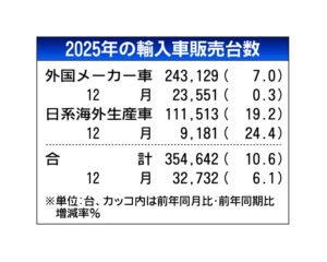25年の輸入車全体の販売台数は同10.6%増の35万4642台で、3年連続のプラスとなった。このうち、外国メーカー車の新規登録台数は同7.0%増の24万3129台で、伸び幅は日本メーカー車に軍配が上がった。