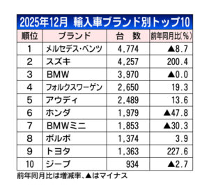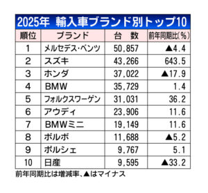 日本自動車輸入組合(JAIA、ゲルティンガー剛理事長)が1月8日発表した統計資料によると、日本メーカーの海外生産車は2025年、前年比19.2%増の11万1513台となり、30年ぶりに過去最高を更新した。前年超えは2年連続。「ジムニーノマド」などインド生産車の輸入を増やしているスズキが、7倍超の4万3266台とけん引した。日米の貿易摩擦を受け、競合他社でも米国生産車の輸入検討も進んでいる。26年の輸入車市場でも、日本勢の存在感が高まる可能性がありそうだ。