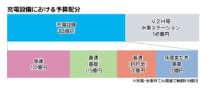 365億円のうち、急速充電器の整備に170億円を充てる。ディーラーやコンビニ、商業施設などでは、高速道路と比べ急速充電器の設置が進んでいない。自宅周辺で短時間の充電が可能になるよう、こうした施設への高出力充電器の設置を強化する。新たに「150キロワット以上」の区分を設け、500万円を上限に工事費を補助。機器の補助上限額は500万円(1口)、700万円(2口)、350万円×口数(3口以上)とする。
