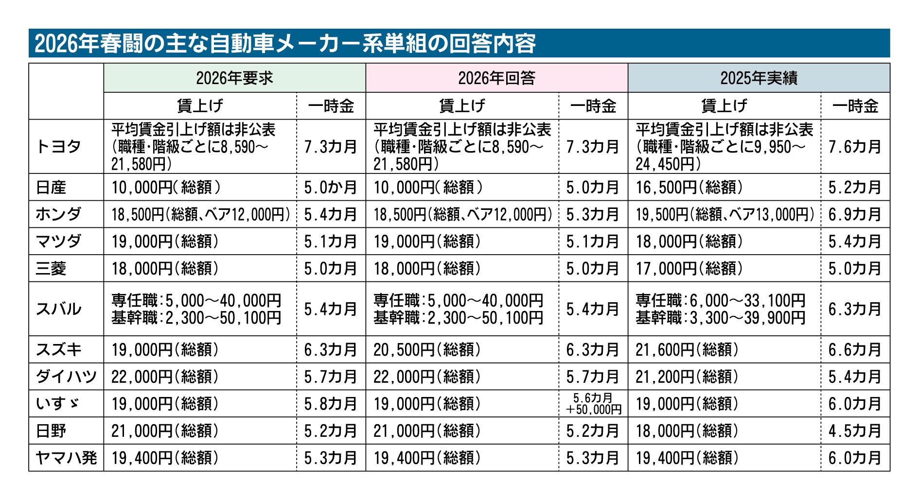 2026年の春季労使交渉(春闘)で自動車メーカーの回答が3月18日、出そろった。二輪車を含む自動車メーカー11社は、各労働組合の賃上げ要求に対して全社が満額回答、もしくは要求を超える額を回答した。自動車総連(金子晃浩会長)によると、全自動車メーカーがそろって満額回答したのは統計以来、初めてという。米国の追加関税や電気自動車(EV)需要の失速などによる業績悪化が顕在化する中、自動車メーカー各社は逆風下でも「人への投資」の手を緩めない姿勢を示した。