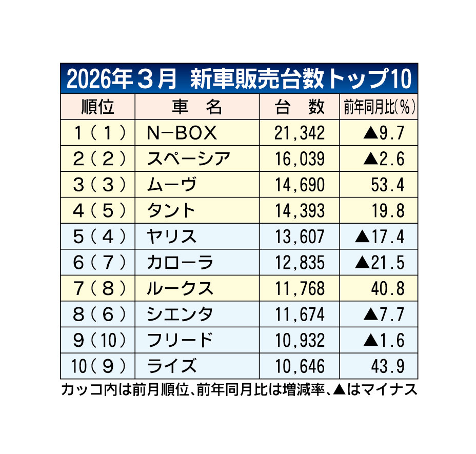 3月の新車販売台数もホンダのエヌボックスが前年同月比9.7%減の2万1342台となり、5カ月連続で首位だった。2位はスズキのスペーシア、3位と4位はダイハツのムーヴ、タントで、上位を軽が独占した。登録車トップの「ヤリス」は、同17.4%減の1万3607台となり、前月の4位から5位に順位を落とした。